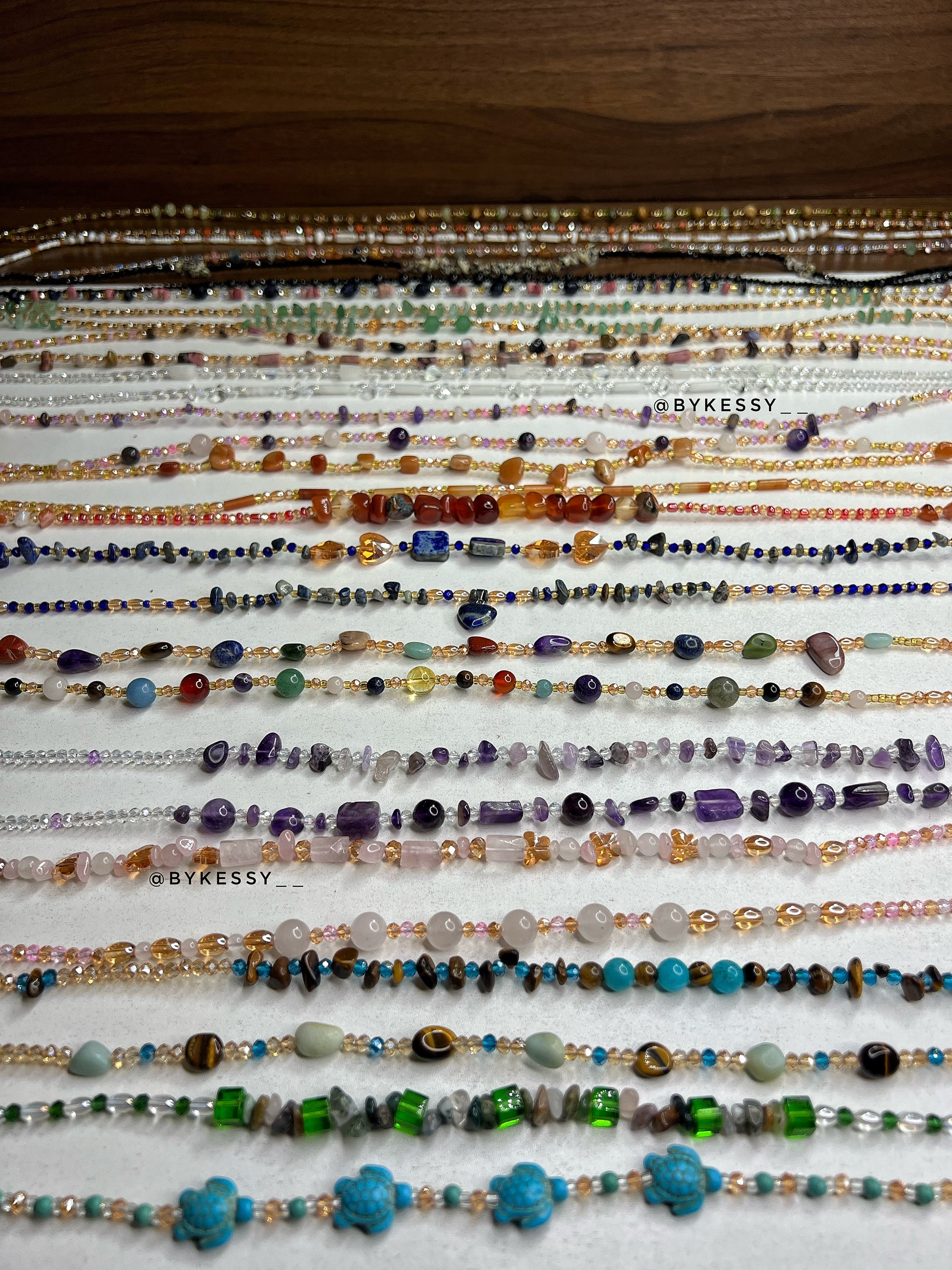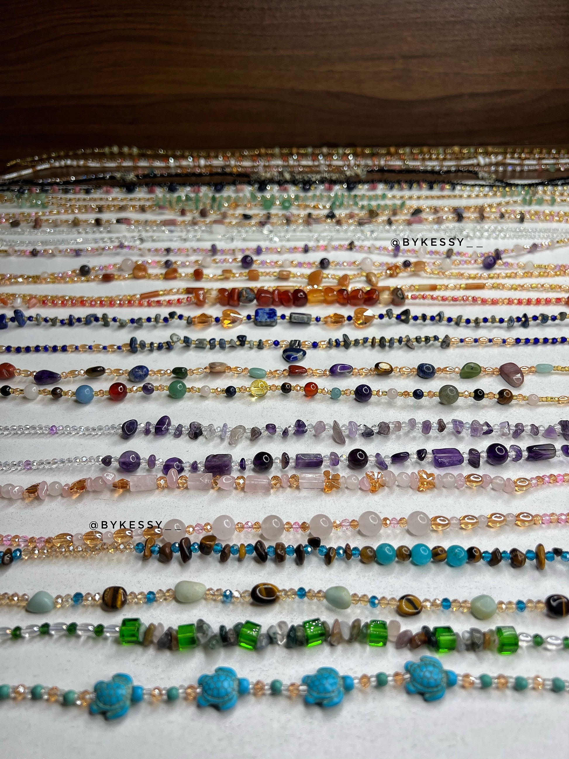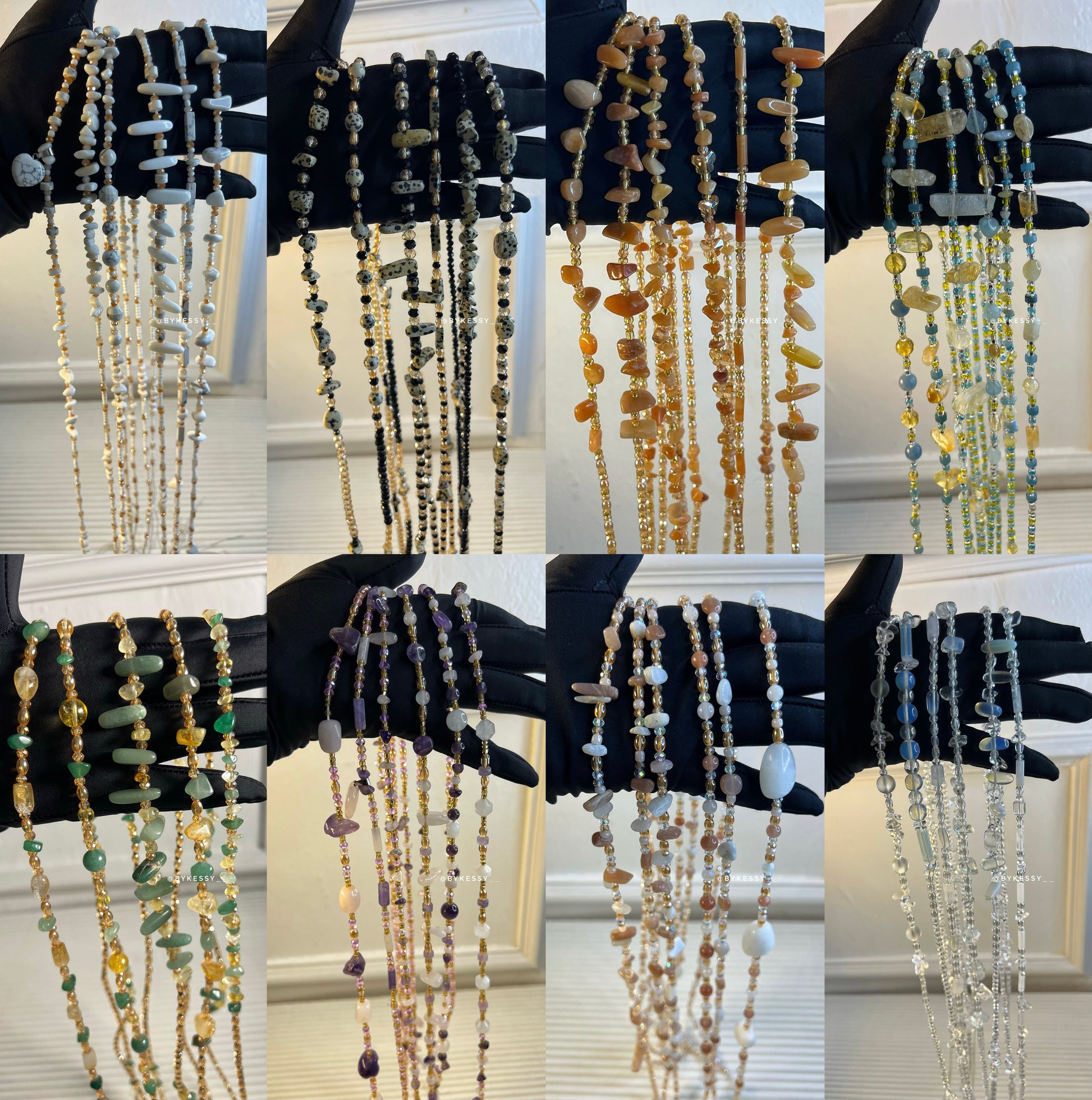 This wholesale listing features 20 to 1,000 strands of handcrafted gemstone waist beads made with crystals believed to support love, protection, abundance, fertility, peace, and personal growth.